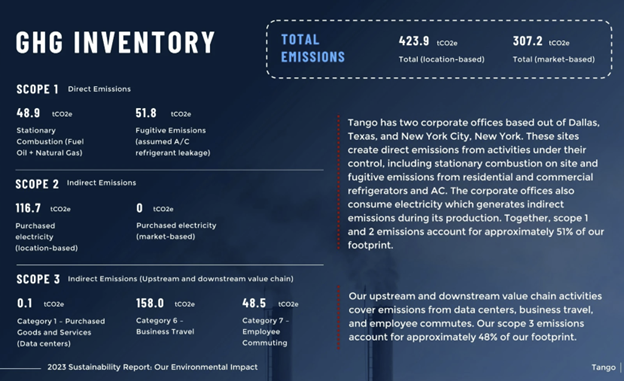 Want to see an example of corporate sustainability goals? Take a look at Tango’s first Sustainability Report, where we lay out the steps we’re taking to reach net-zero emissions by 2030, reach a 50/50 male-to-female workforce ratio, and more.