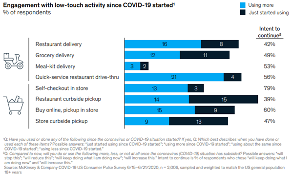 In addition to shifting brand loyalties, US consumers are also changing how they shop in response to health and safety concerns. “Technologies that enhance hygiene, particularly contactless activities such as food and grocery delivery and curbside pickup, are taking off,” say the report’s authors.