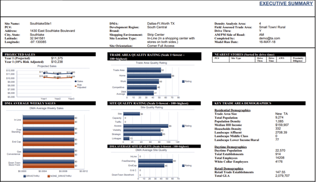 Sales forecasting is where you ultimately decide on the best location. It’s where your data feeds into a model and creates a hypothesis: “if we put our store in this trade area, at this intersection, in this type of facility, with this level of accessibility, with this amount of activity, we can expect sales figures like these over time.”