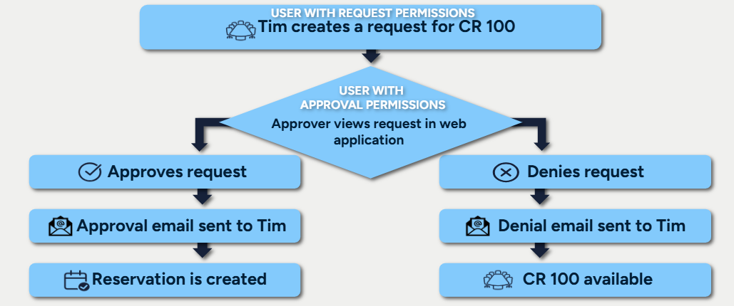 At the same time, executives or other designated roles can simply reserve the room as needed when it’s available, without following the request process.