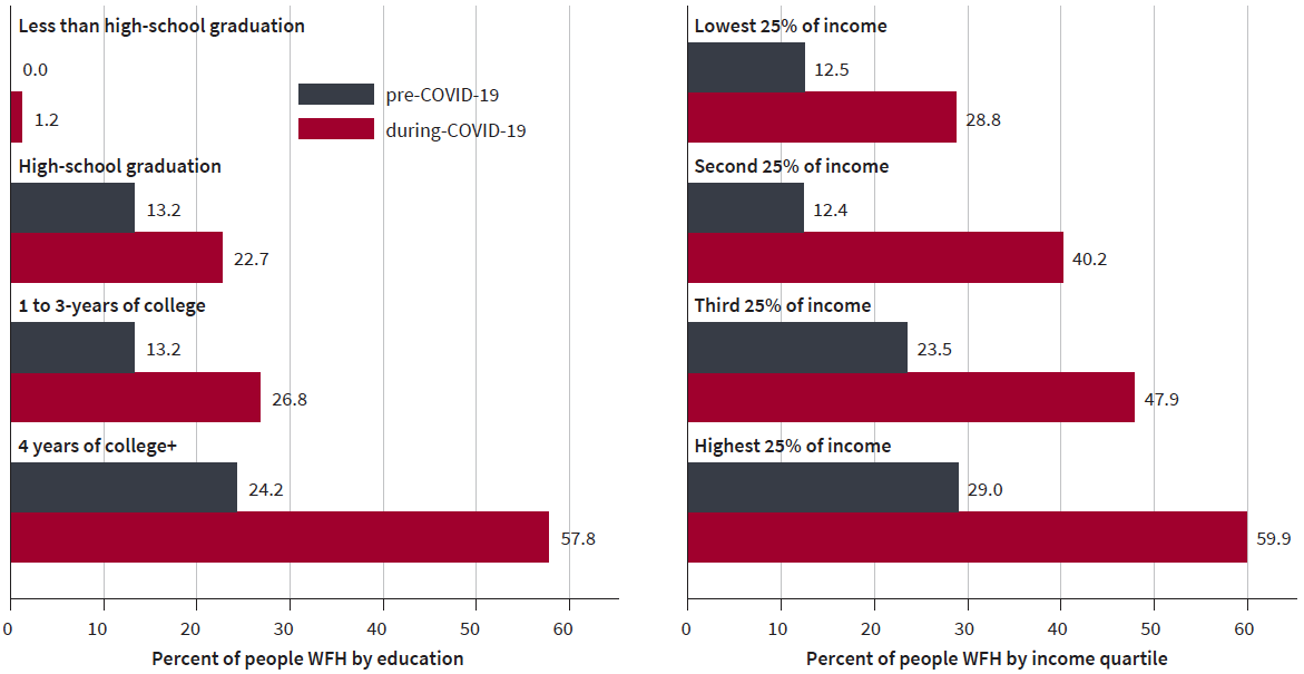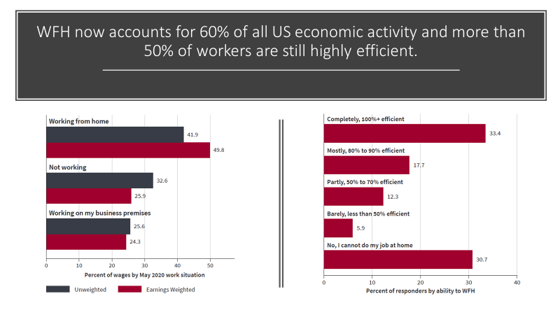 The shift to remote work was dramatic and transpired practically overnight. According to a June 2020 research piece from Stanford’s Institute for Economic Policy Research (SIEPR), WFH now accounts for 60% of the US economy and more than 50% of workers are still highly efficient.