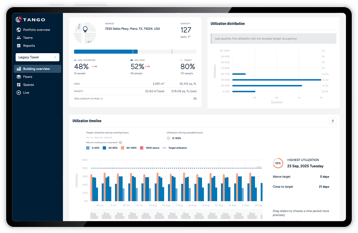 Organizations use Tango Occupancy to uncover underused space, inform lease decisions, and align hybrid policies with how people actually work—portfolio‑wide.